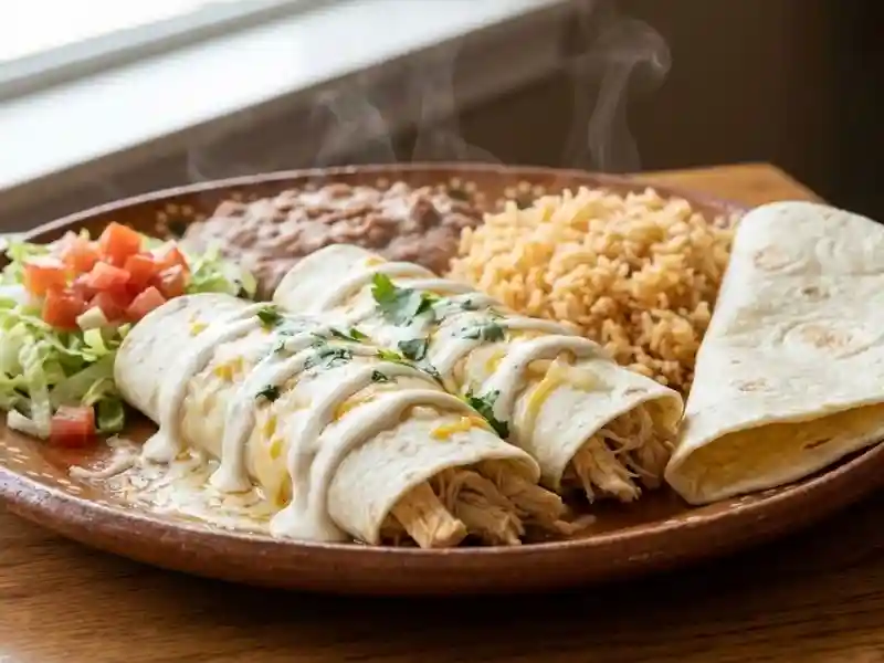 Savor the comfort of Rosa’s chicken enchilada plate, a fan favorite on the rosa’s cafe menu. Tender chicken enchiladas smothered in creamy sour cream sauce, paired with rice, beans, fresh garnish, and warm tortillas for a crave-worthy Mexican meal.