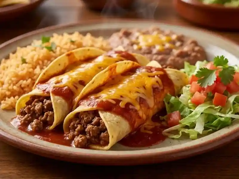This meal is often described as a generous plate featuring three burrito-style wraps filled with seasoned ground beef. Each burrito is rolled in soft tortillas and typically paired with Mexican-style rice, beans, fresh lettuce, and tomato garnish. Flour tortillas are usually served on the side to complete the plate.