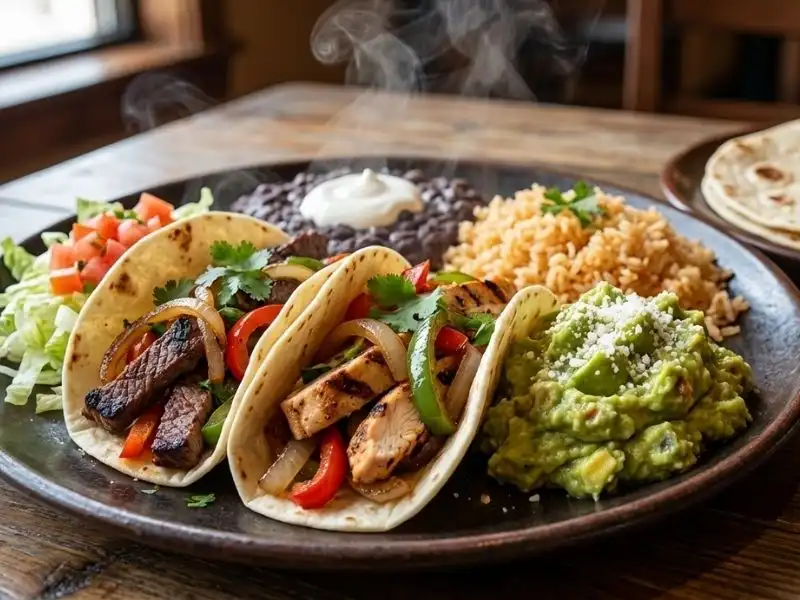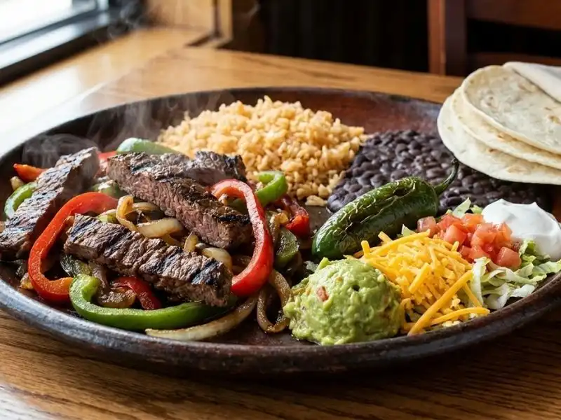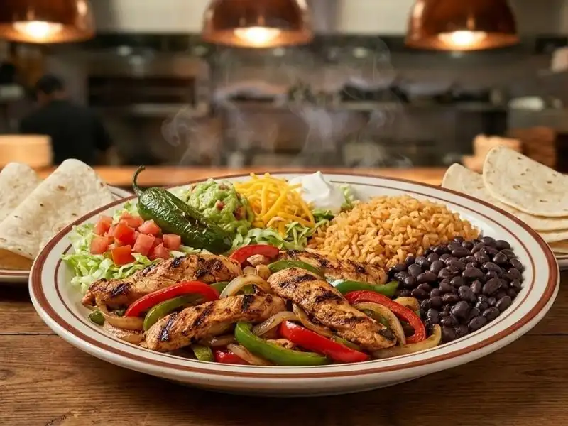 Sizzle into flavor with the Fajita Carbon Plate from the Rosas Menu two hot fajita tacos with beef, chicken, or both, creamy guacamole, Mexican rice, beans, fresh toppings, and warm flour tortillas made to satisfy real Tex-Mex cravings.